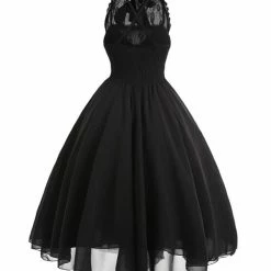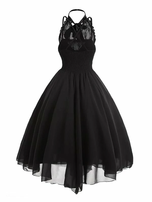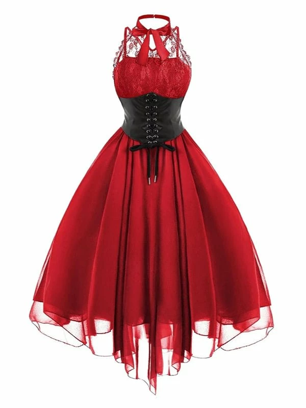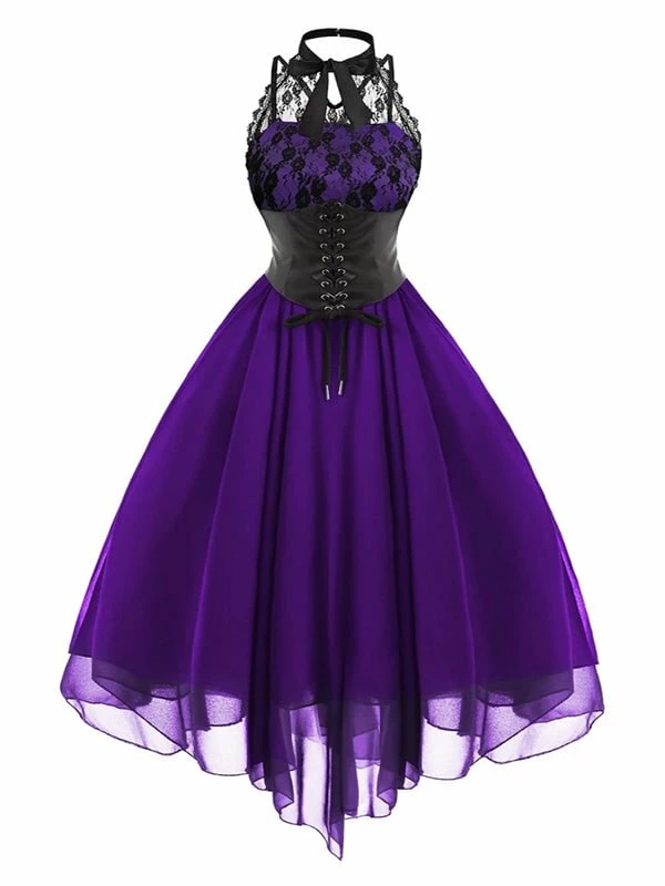 The gothic dress has lace paneled. Vintage and elegant. Design adds the sense of layering. Asymmetrical pattern, backless, halter and tight waist. 3 colors you could choose and 8 sizes are provided. Dating, party or daily clothing.