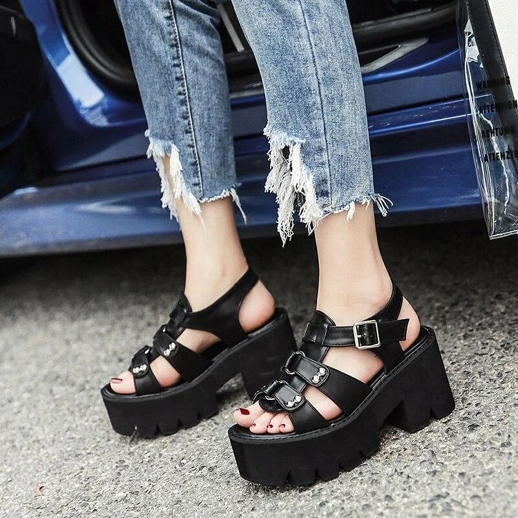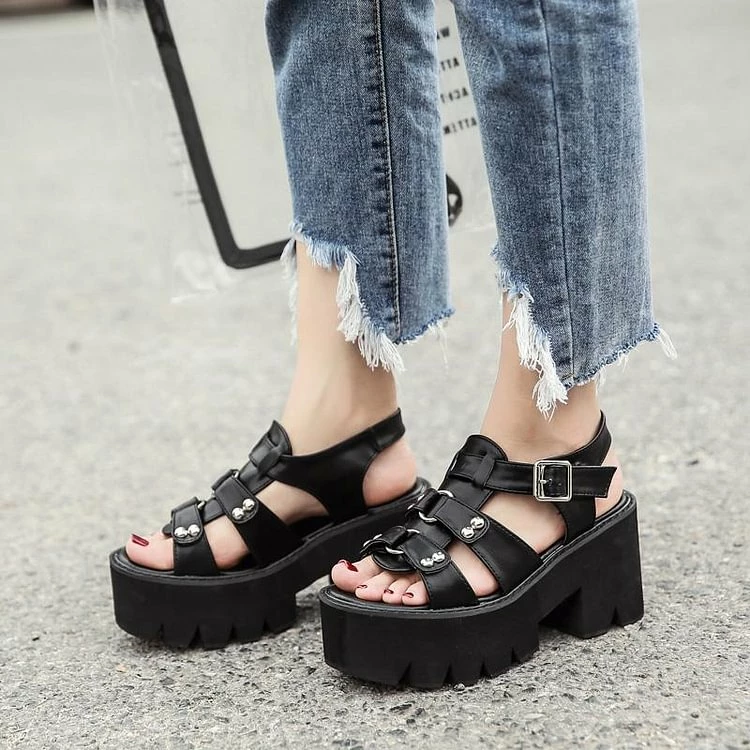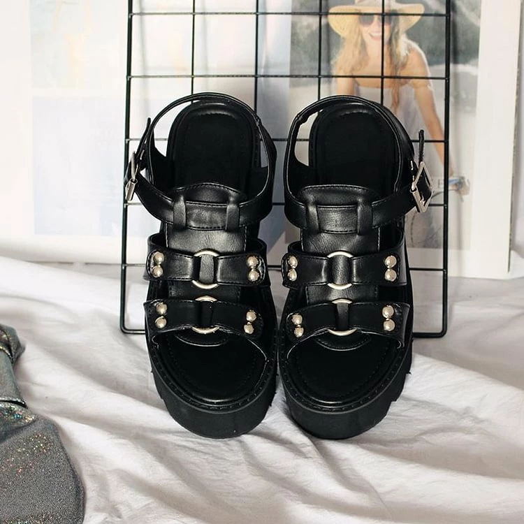 This gothic sandals made by rubber sole. 3.3 inches heel height. The elements of industrial style sandals are in it, strappy, ankle strap, peep toe, platform and chunky heel. You are the cool and statement man. Steady wedge brings comfort to you , making you relax for one day.