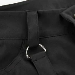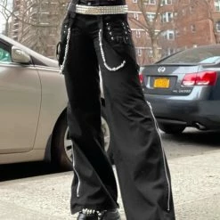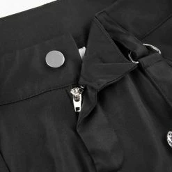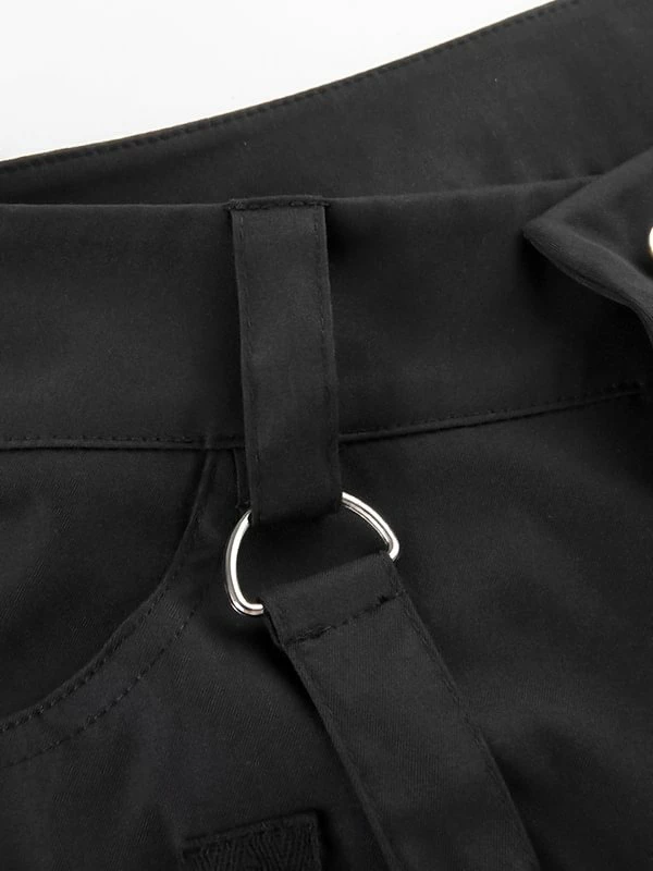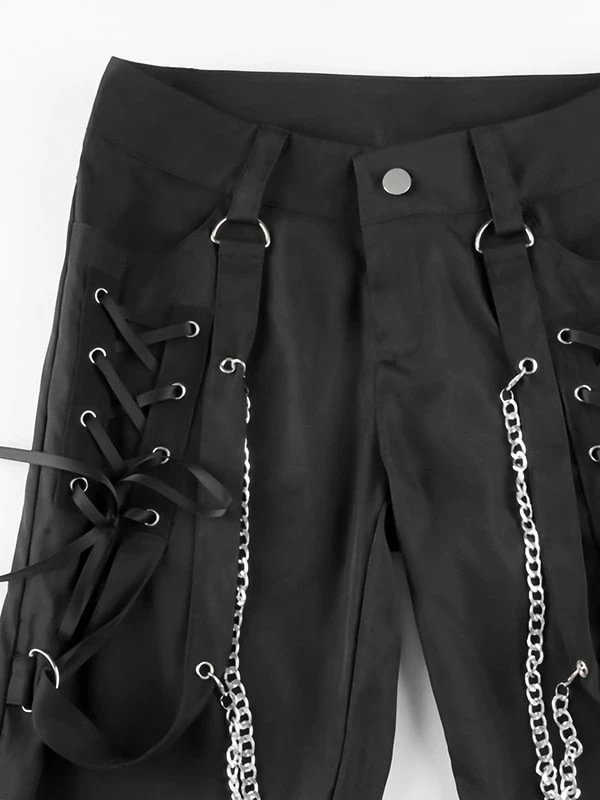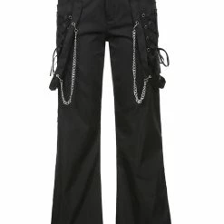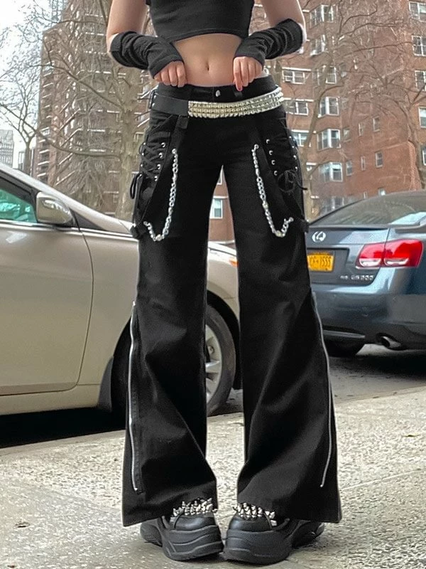 The flare cargo pants, punk style, appeals attention. The material of pants is durable and comfortable to improve its texture. The high rise design highlights your waist to optimize your body ratio visually. The muti-pockets, steamers, side zippers and chains trimmed are decorated on the pants, feeling more darkness and cool. The pair of cargo pants is easy to wear and goes with anything. You could wear it when going hiking, shopping, dating and so on. Believe me, after wearing, you will love it.