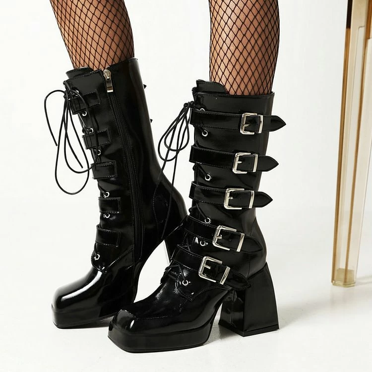 Dark Vintage Multiple Straps Size Zipper Square Toe Chunky Heel Boots