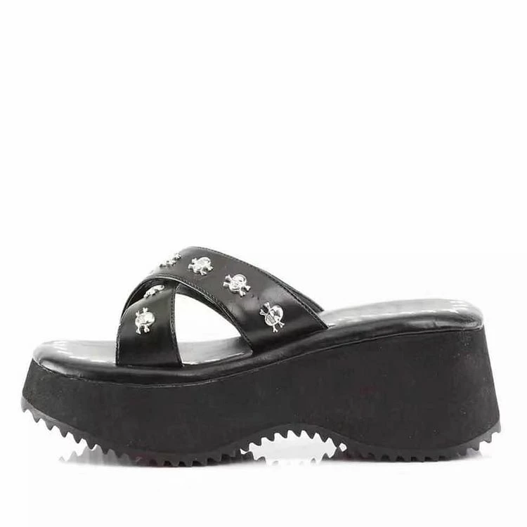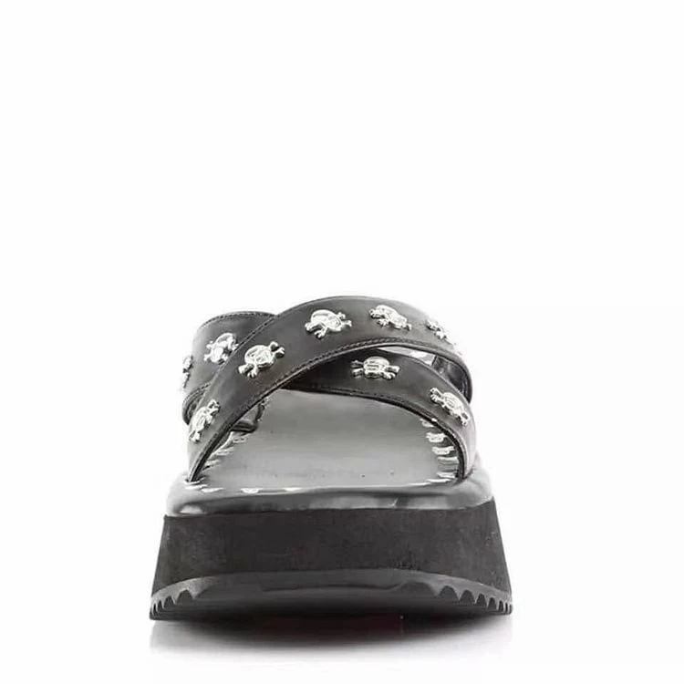Goth Skull Crisscross Straps Platform Slippers