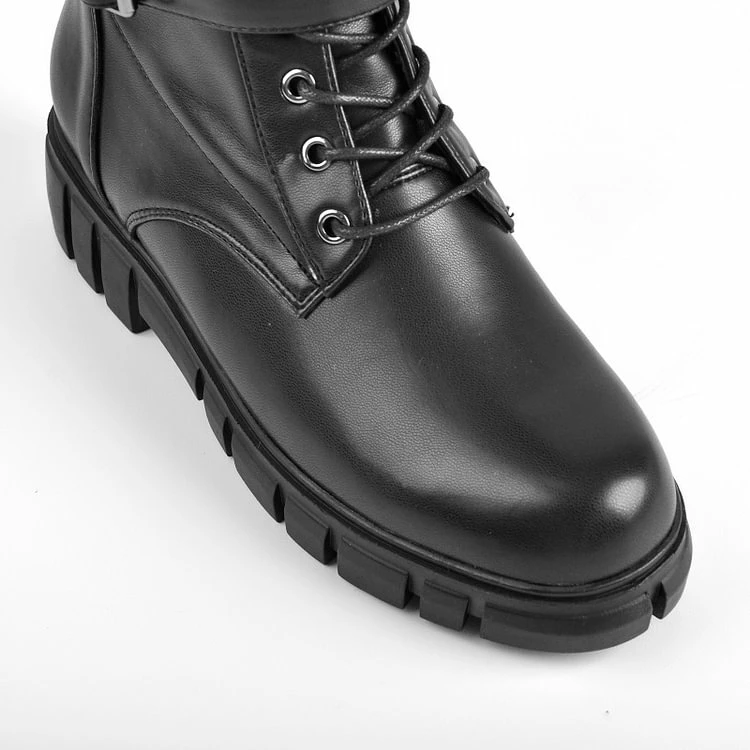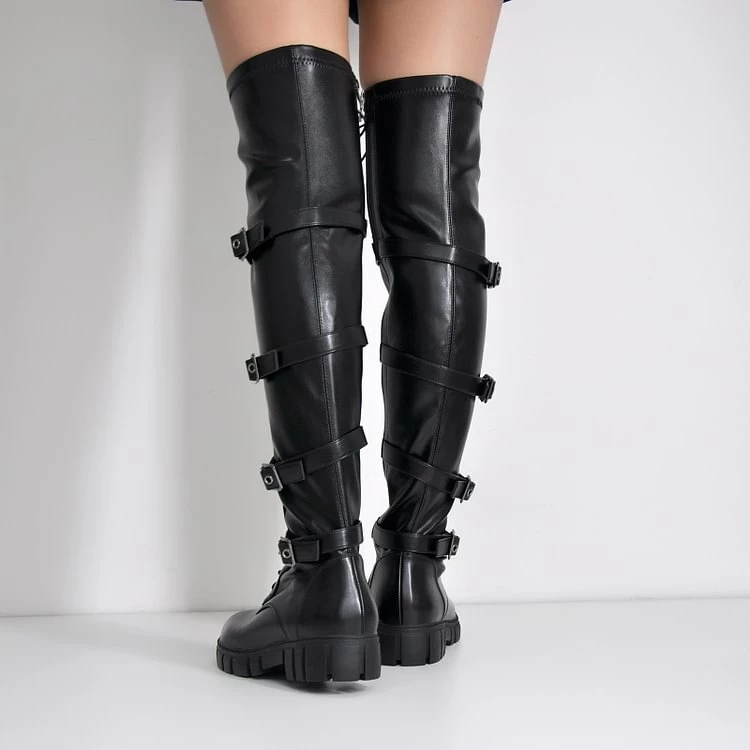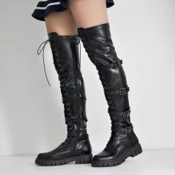 The elements of gothic style boots are in it, PU, lace-up, cross chain-trimmed and belts with key-holes. You are the cool and statement woman.Flat heel brings comfort to you , making you relax for one day. Over the knee high boots could let your legs slimmer and optimize your body ratio. You are the one.