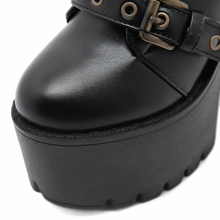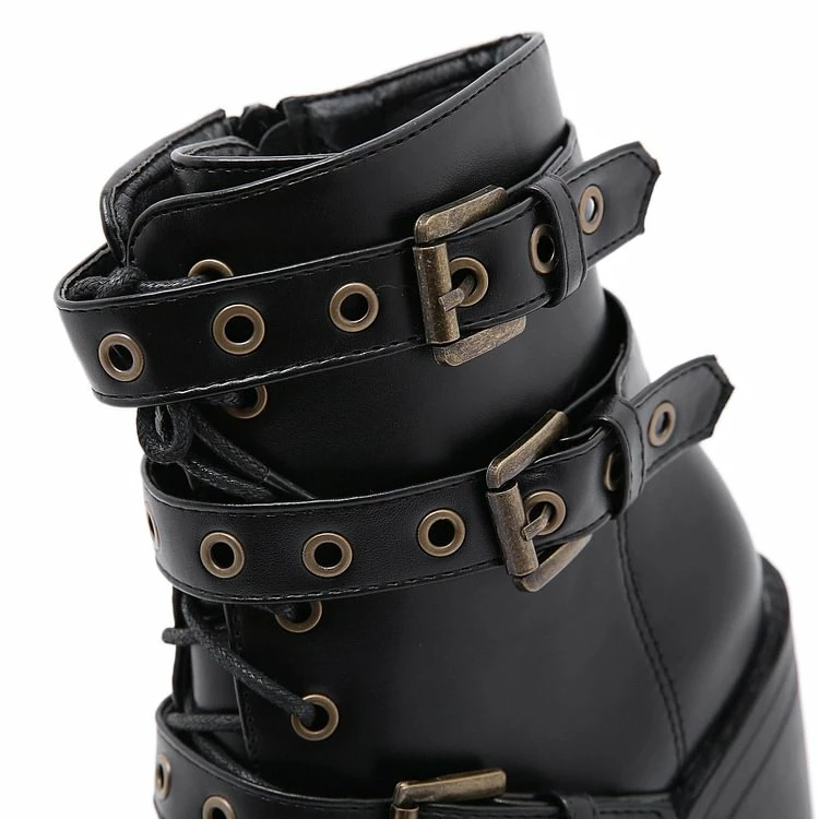 The elements of industrial style boots are in it, PU, lace-up, cross chain-trimmed and belts with key-holes. You are the cool and statement woman. Steady chunky platform brings comfort to you , making you relax for one day. Chunky platform could let your legs slimmer and optimize your body ratio. You are the one.
