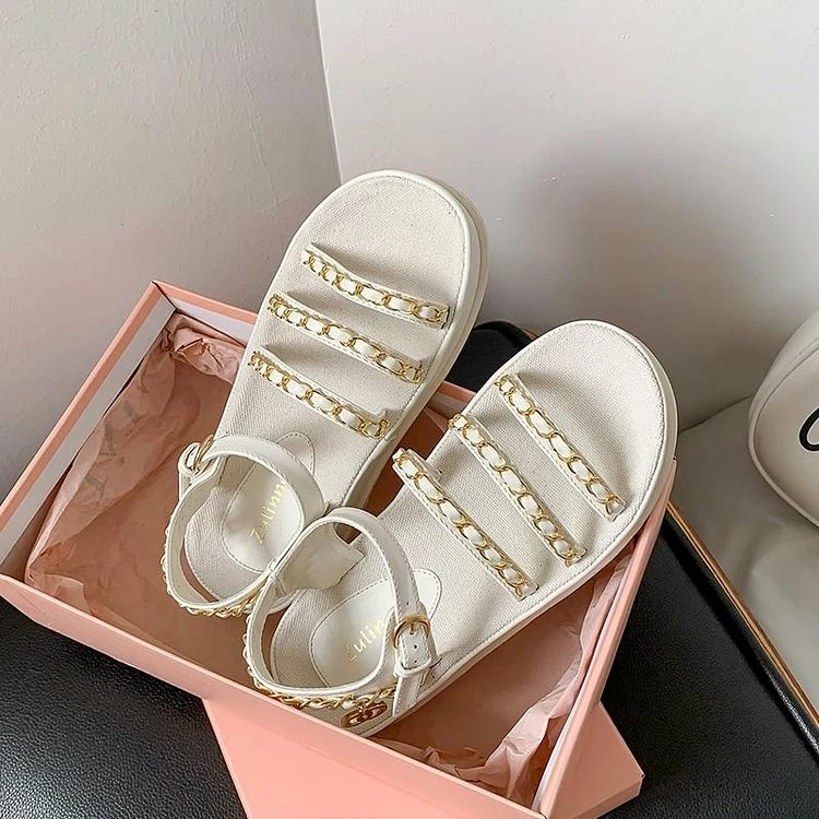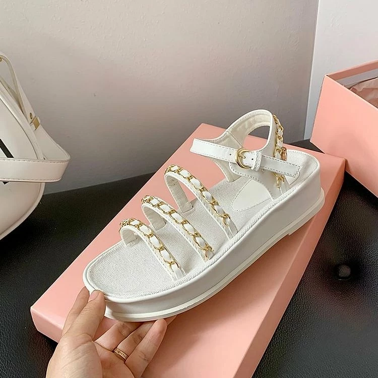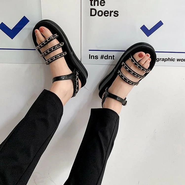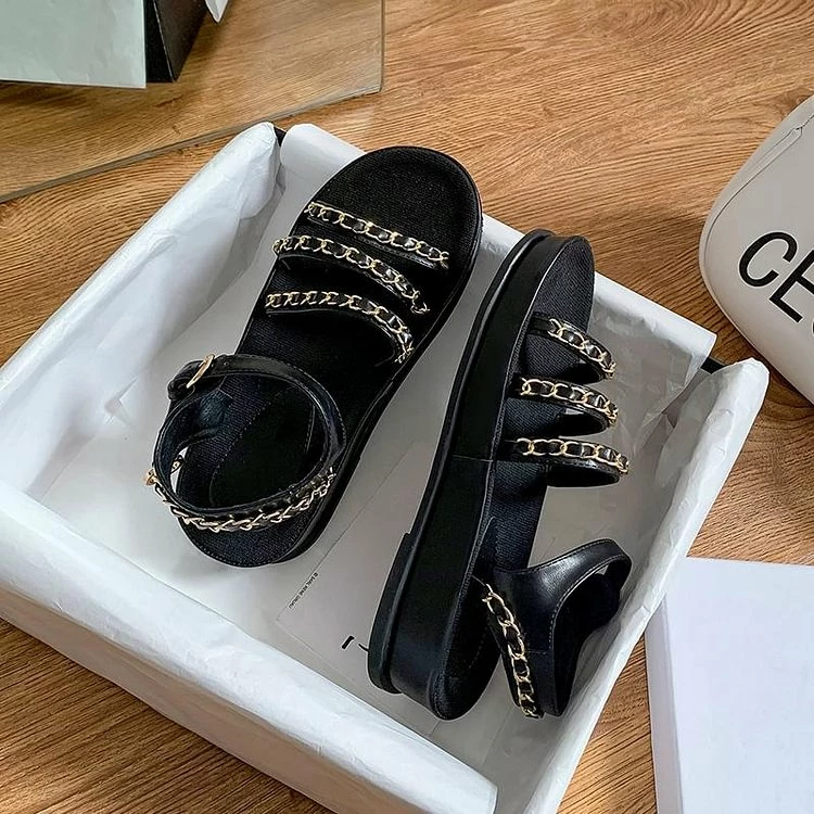 Rubber sole. 1.18 inches heel height. Belts with chain-trimmed is delicate, adding color to the shoes. Flats is close to the ground, approaching the nature. Chain-trimmed belts keeps pace with the trend of times. Round toe ankle strap flats sandals is classic and delicate.