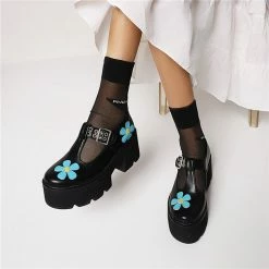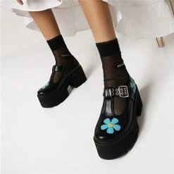 This fashion pumps made by rubber sole. 2.9 inches heel height. The elements of industrial style pumps are in it, floral pattern,round toe,platform and ankle strap. You are the cool and statement man.Steady platform brings comfort to you , making you relax for one day. Chunky heel could let your legs slimmer and optimize your body ratio. You are the one.